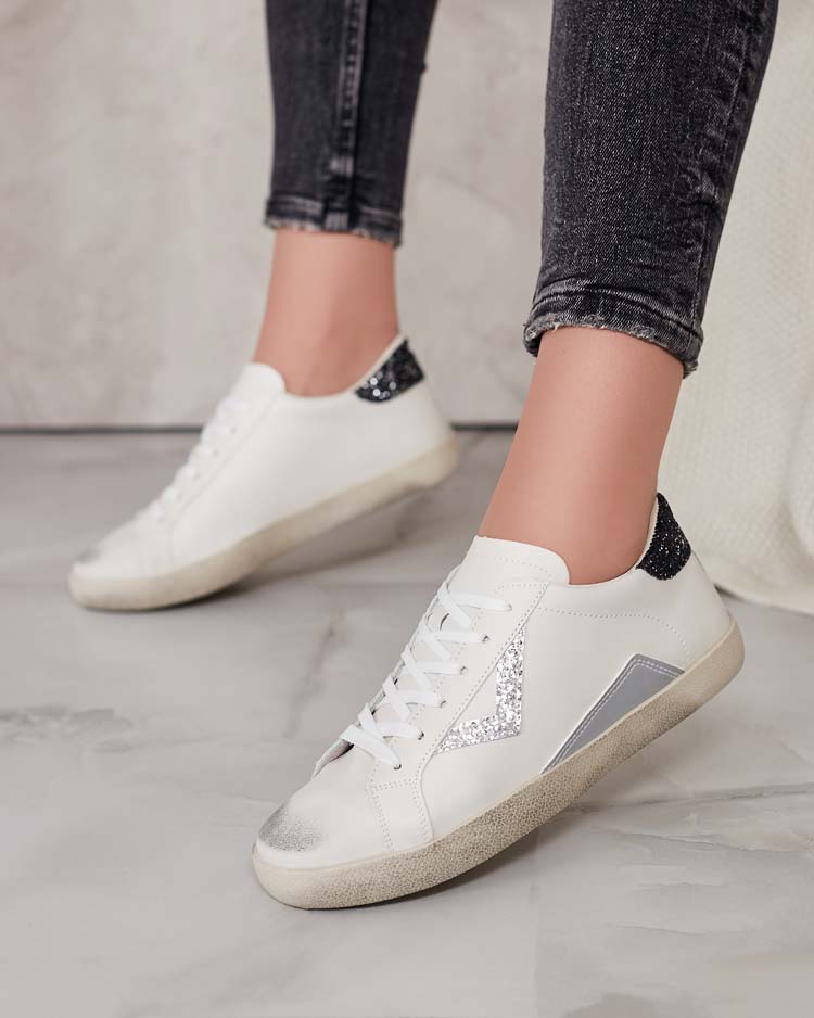- Дамски маратонки от еко кожа на равна подметка - перфектната комбинация от стил и комфорт. Моделът е с дантела, има стелка от еко кожа. Горната част е украсена с декоративни вложки от брокат. Перфектни за ежедневните тоалети!