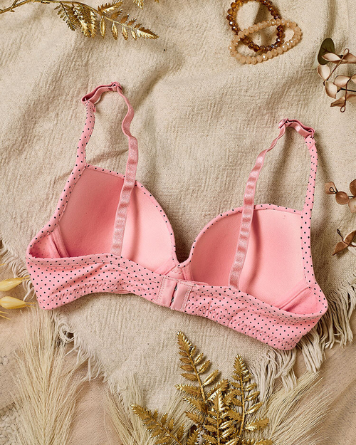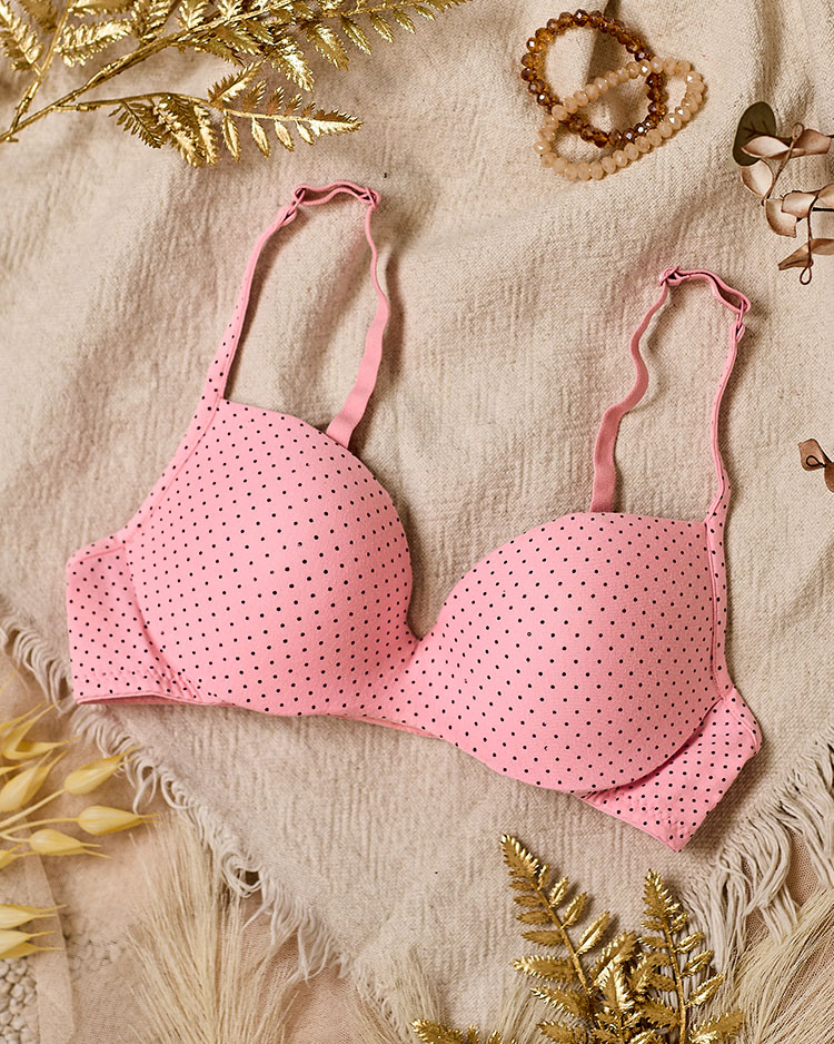 • Уникален дамски сутиен, украсен с десен на точки. Продуктът се закопчава на гърба със закопчалка с кука и примка. Презрамките са с регулируема дължина. Той ще се отрази добре на ежедневното носене! ЗАБЕЛЕЖКА: Точност на измерването (+/-) 1 см.