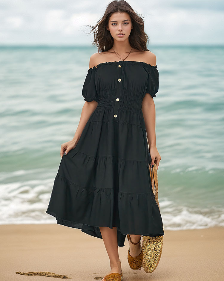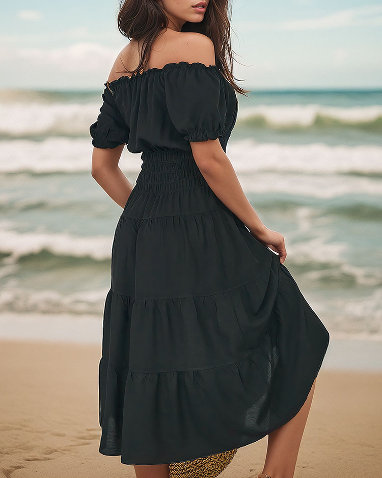 - Дамска испанска рокля от лека материя. На височината на талията е с ластик. Продуктът е с дължина до коляното, има къси ръкави и ластик на деколтето. Почувствайте лятото в този модел!