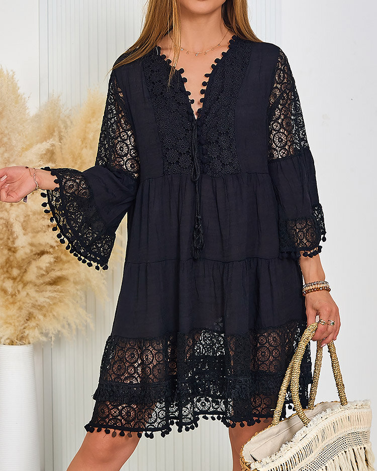 - Дамска плажна рокля тип surplice, изработена от мека материя, украсена с дантелени вложки. Моделът е с дълги 3/4 ръкави и сърцевидно деколте. ЗАБЕЛЕЖКА: Точност на измерването (+/-) 1 см.