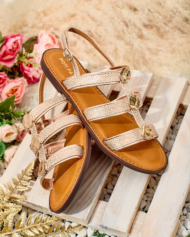 - Дамски сандали с плоска подметка, с каишки от екокожа и стелка от екокожа. Представените дамски обувки се закопчават с катарама. Те прилягат добре на крака!
