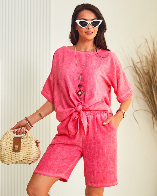 • Дамски овърсайз комплект, изработен от приятен материал. Блуза с къс ръкав и къси панталони с еластичен колан. Плюс колие, включено в комплекта. Почувствайте лятото в този прекрасен комплект!