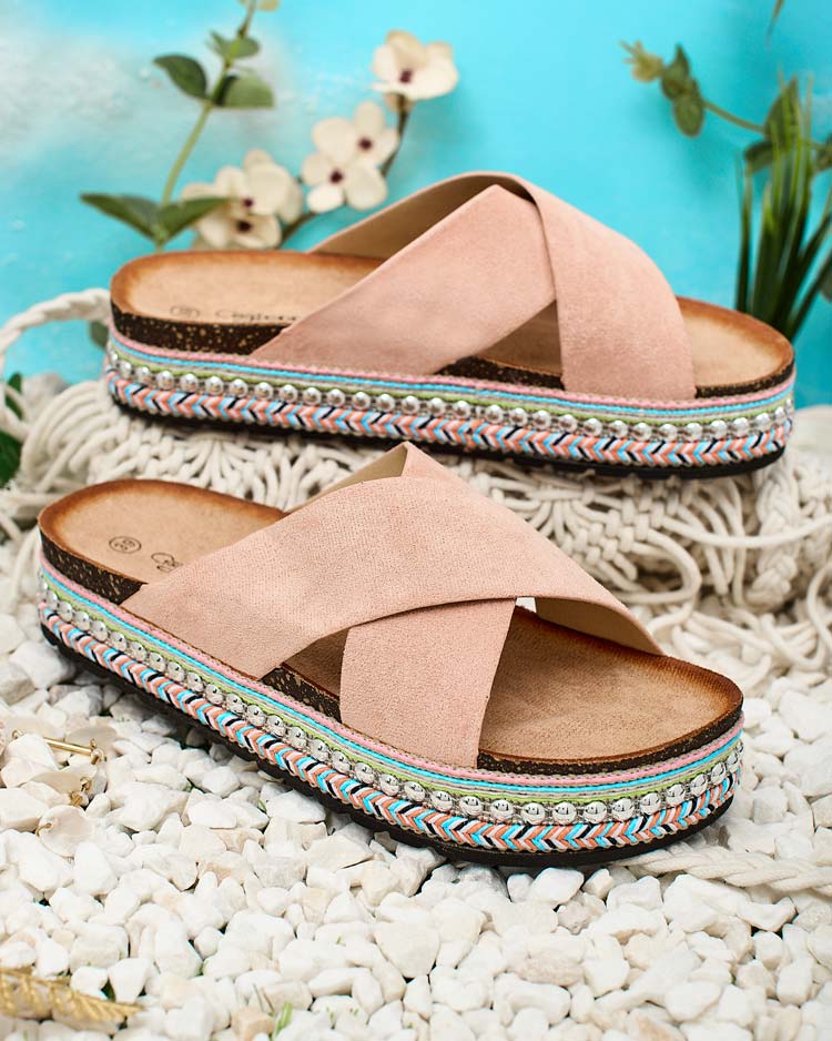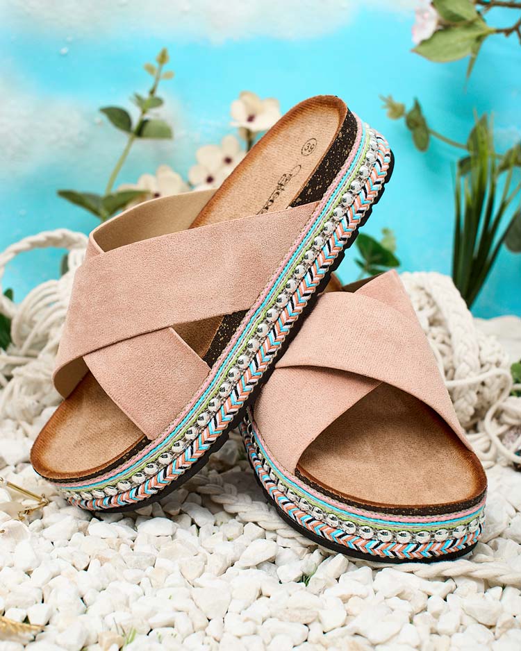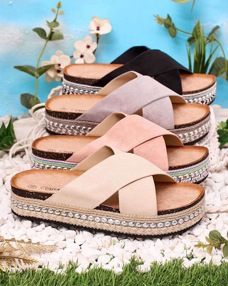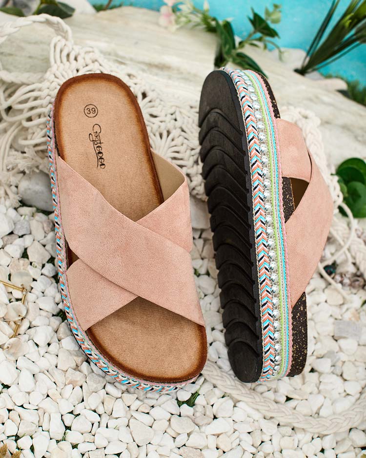 - Страхотни дамски джапанки с равна подметка. Изработени са изцяло от еко кожа от велур. Подметката е декорирана с материал а'ла корк. Перфектен избор за ваканциите!