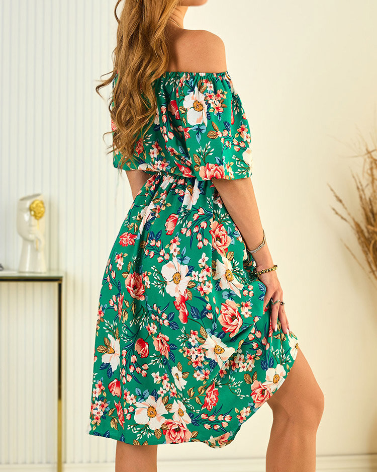 - Десенирана дамска рокля a'la hiszpanka, изработена от лека материя. На височината на талията е с ластик. Продуктът е с миди дължина, има къси ръкави и ластик на деколтето. Почувствайте лятото в този модел!