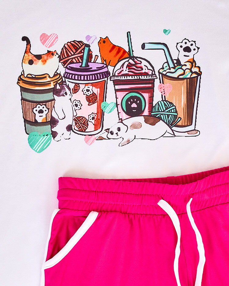 - Дамски екип от приятен материал. Моделът е с декоративна щампа. Блуза с къс ръкав и къси панталонки с еластичен колан. Почувствайте лятото в този прекрасен комплект!