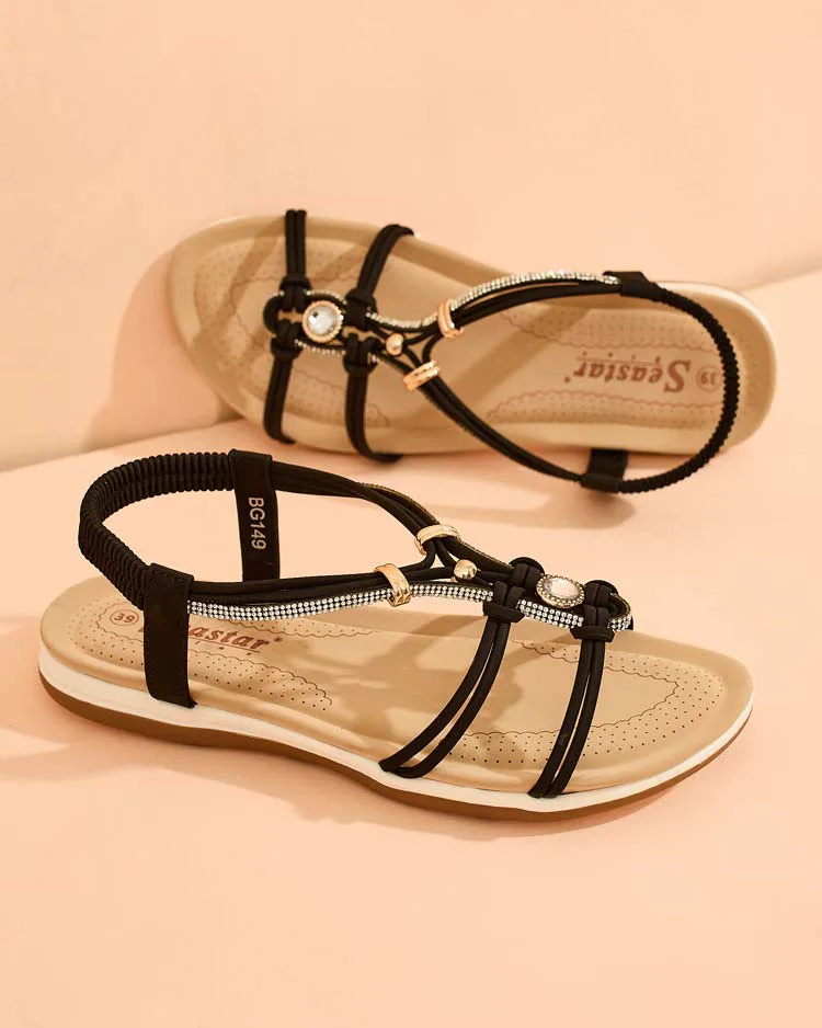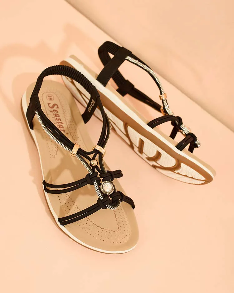- Дамски сандали с равна подметка - идеална идея за горещите летни дни. Моделът изцяло изработен от екологична кожа. Горната част е украсена с кристали и декоративни циркони.