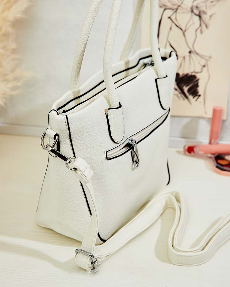 • Малка дамска чанта с цип, изработена от екокожа. Моделът разполага с 2 отделения и 4 джоба. Освен това има сваляща се, регулируема каишка. Перфектна за ежедневна употреба!