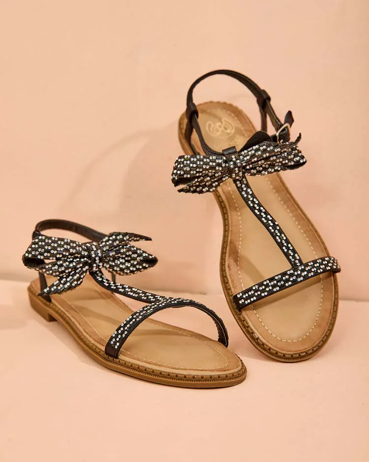 • Модерни дамски плоски сандали, изработени изцяло от еко кожа. Закопчават се с катарама, а горната част е украсена с фина панделка, която им придава финес. Идеални за летни разходки и специални поводи!