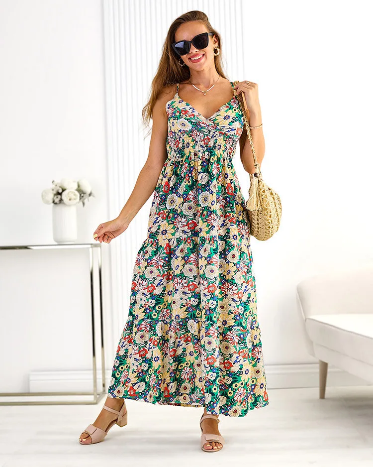 - Десенирана дамска рокля с миди дължина, изработена от приятна памучна материя. Моделът е с регулируеми презрамки, с V-образно деколте и еластична ширина на талията. Носете я със сандали! ЗАБЕЛЕЖКА: Точност на измерването (+/-) 1 см.