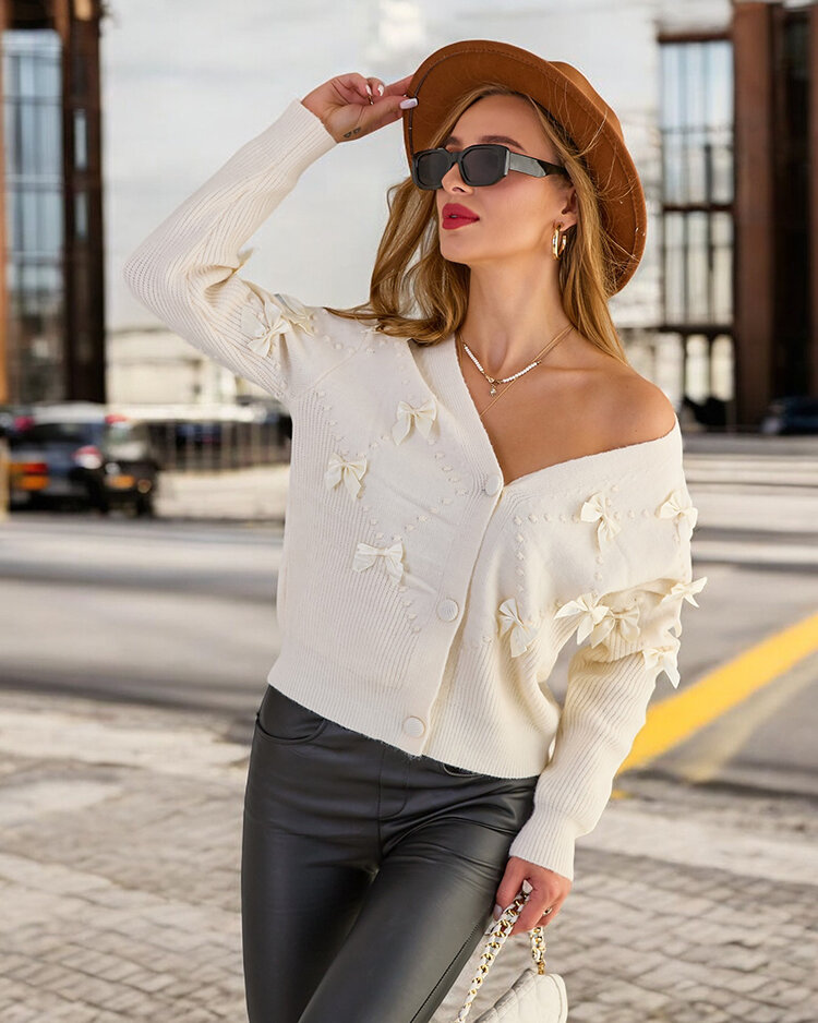 - Този уникален къс пуловер е есенция на комфорт и чар. Изработен от мека материя, пуловерът е с дълги ръкави, копчета и декоративни панделки.