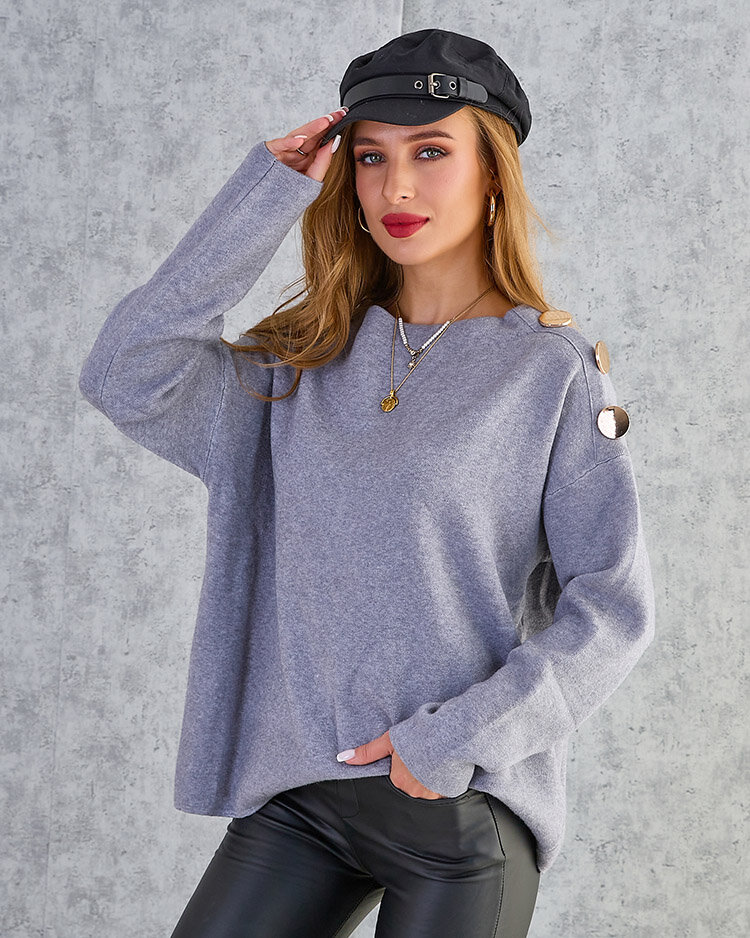 - Дамски пуловер с кръгло деколте, изработен от приятна материя. Моделът е с дълги ръкави и декорации на раменете. Този пуловер съчетава удобството с оригинален стил.