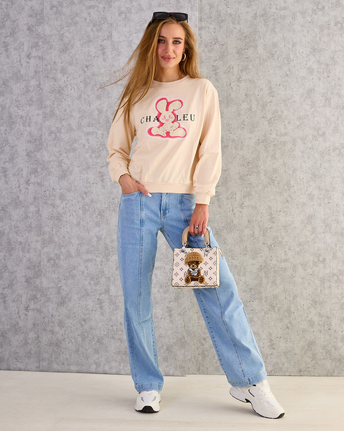 - Придайте стил на тоалетите си с нашия тънък суитшърт, украсен с кръпка на зайче. Вмъква се през главата, с кръгло деколте и дълги ръкави. Перфектен за всеки ден, когато искате да се чувствате небрежно, но стилно!