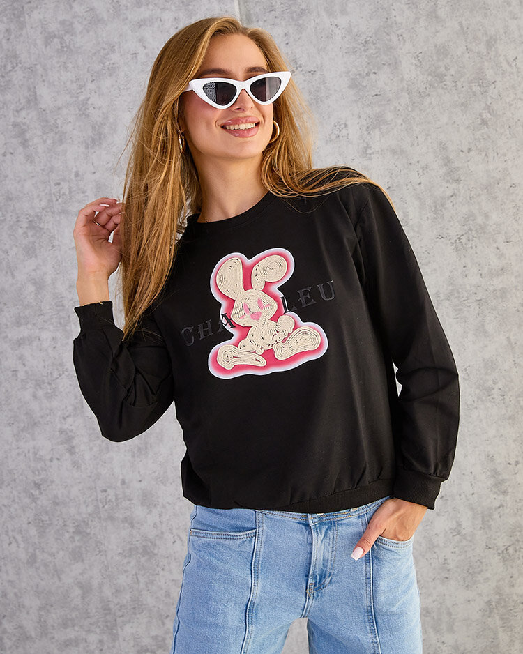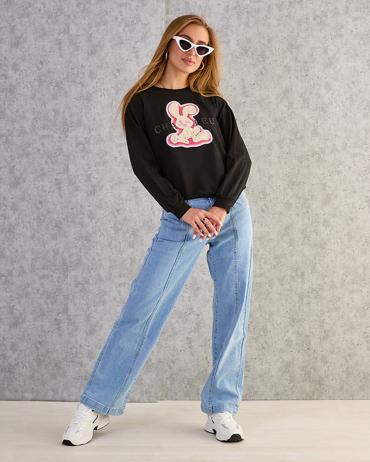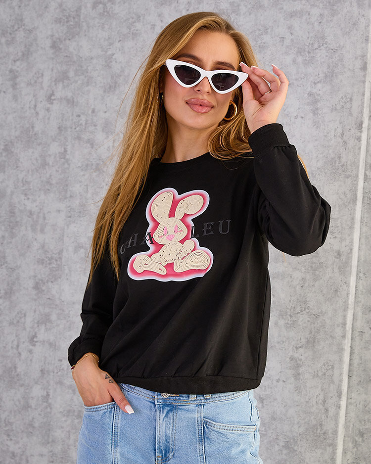 - Придайте стил на тоалетите си с нашия тънък суитшърт, украсен с кръпка на зайче. Вмъква се през главата, с кръгло деколте и дълги ръкави. Перфектен за всеки ден, когато искате да се чувствате небрежно, но стилно!