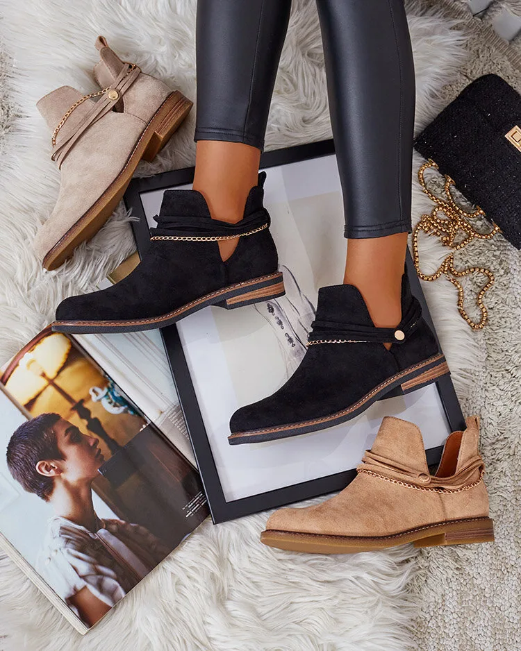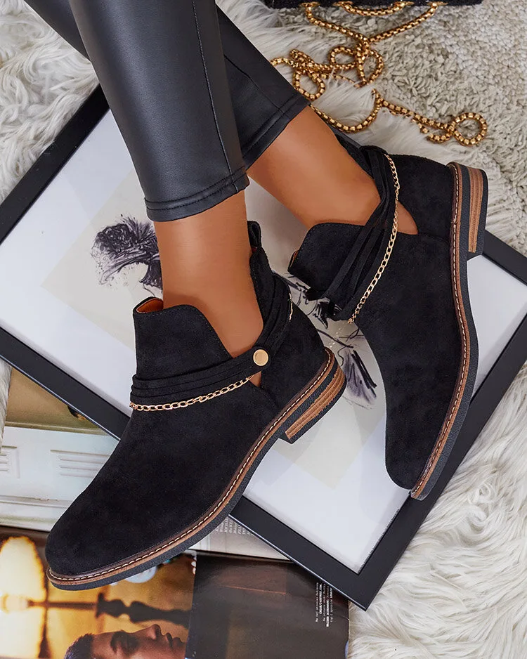 - Стилните дамски ботуши от еко велур със стелка от естествена кожа са идеални за по-студените дни. Модел с приплъзване с декоративни верижки в горната част. Обувките са на плосък ток и с кръгли пръсти. Супер допълнение към вашите ежедневни тоалети!
