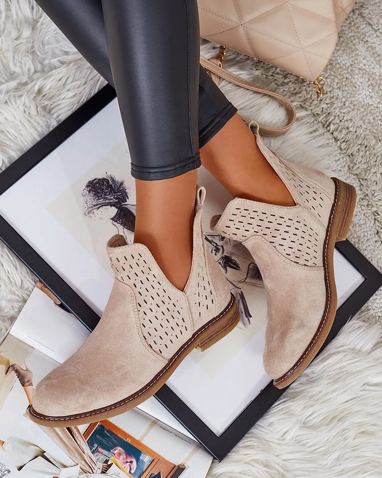 • Ботуши с плоска подметка - стил и комфорт в едно. Изрязването в областта на глезена улеснява обуването. Изцяло изработени от еко велур и естествена кожа отвътре. Този модел ще ви вдъхне увереност!