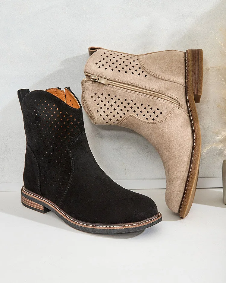 - Стилните дамски ботуши от еко велур със стелка от естествена кожа са идеални за по-студените дни. Ажурната горна част се закопчава с цип. Моделът е на плосък ток и с кръгъл нос. Супер допълнение към ежедневните ви тоалети!