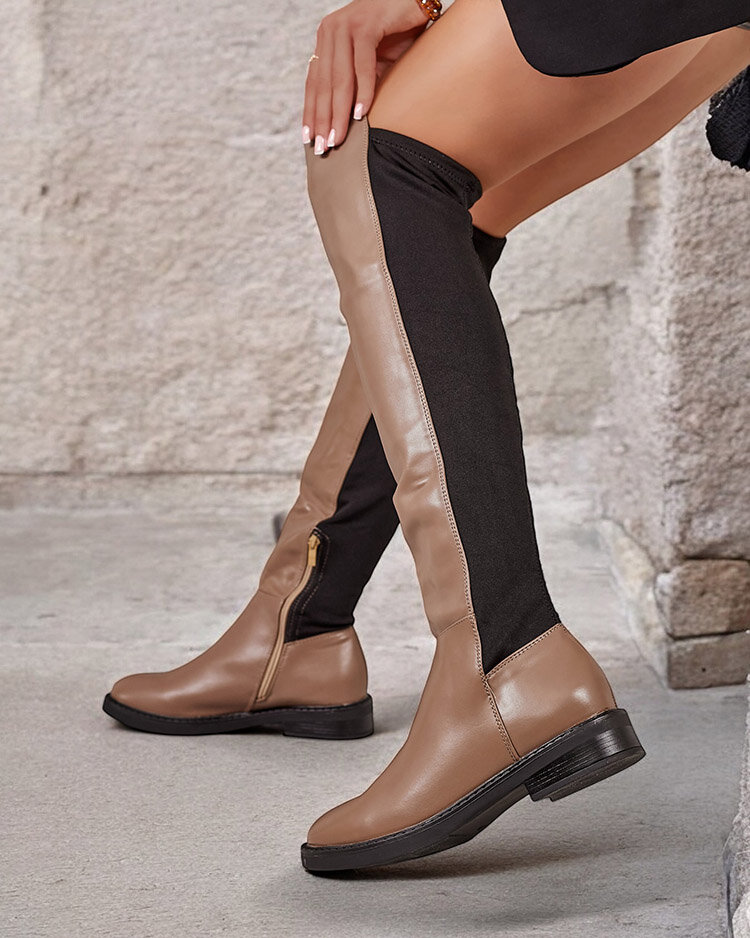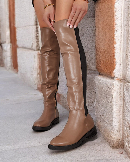 - Дълги дамски ботуши с по-дебела подметка, горна част от еко кожа в комбинация с плат. Ботушите се закопчават с цип до средата на прасеца. Перфектна основа за много зимни тоалети!