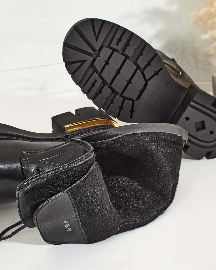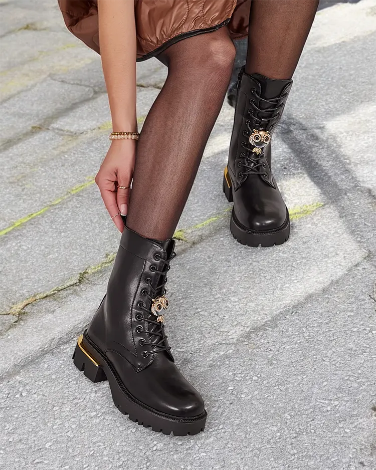 - Стилни ботуши от екокожа. Ботушите са с връзки и ципове, имат по-дебела гумена подметка и кожена стелка. Обувките са с декоративна горна част. Перфектни за есента!