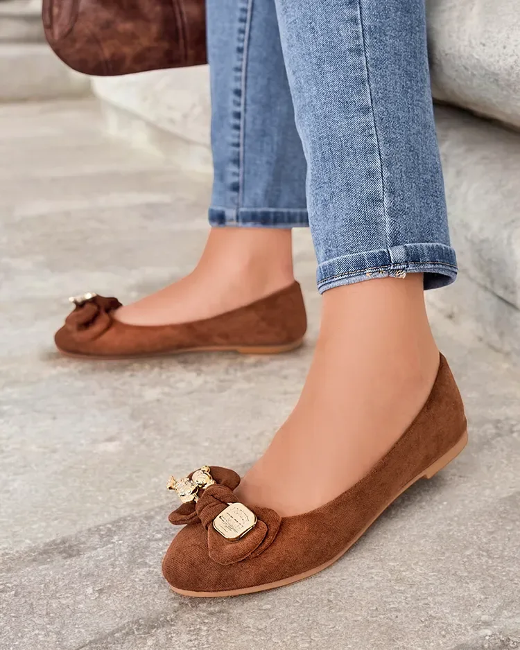 - Дамски балерини на плосък ток, изработени от еко кожа и стелка от еко кожа. Моделът е с кръгъл нос с декоративна панделка. Супер допълнение към ежедневните ви тоалети!