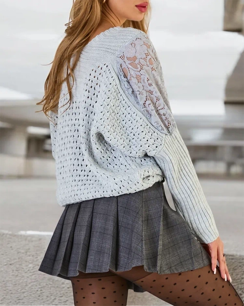 - Ажурен дамски пуловер със сърцевидно деколте, изработен от приятна на допир материя. Моделът е с дълги ръкави, украсени с дантелени вложки. Той е идеален избор за различни поводи.