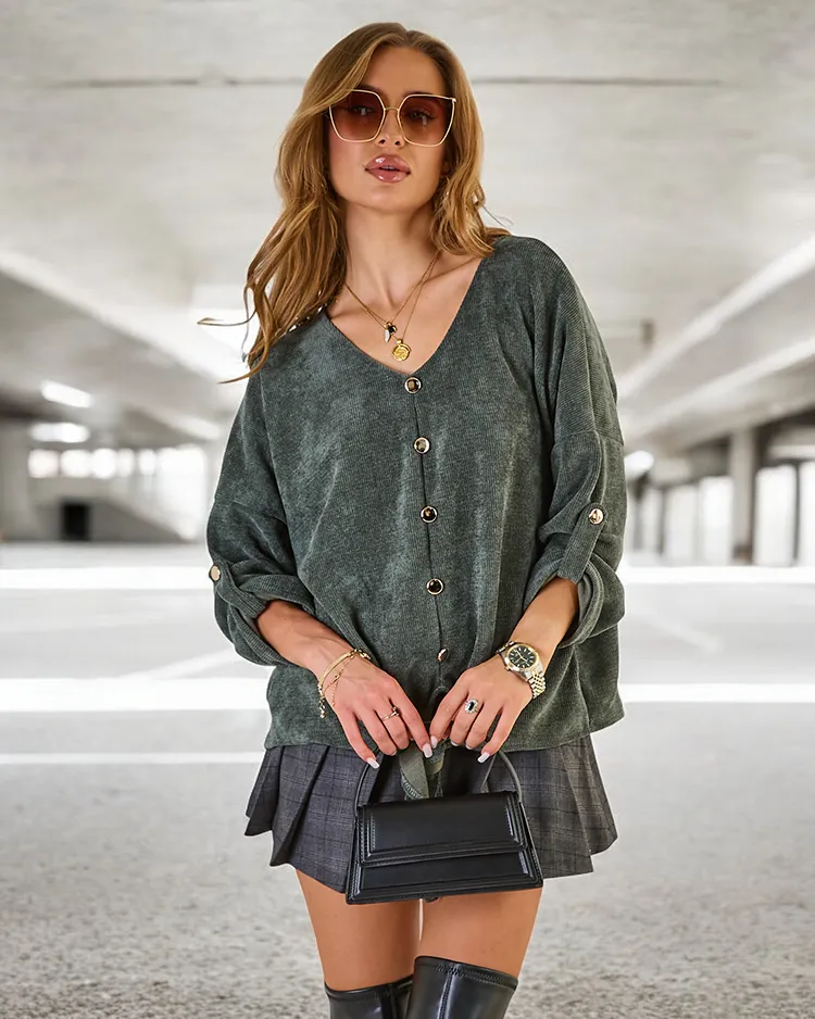 - Модерен дамски пуловер, изработен от тънка и мека материя. Моделът е с кръгло деколте и дълги ръкави. Декориран е с копчета и връзки - идеален за празнични тоалети!
