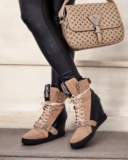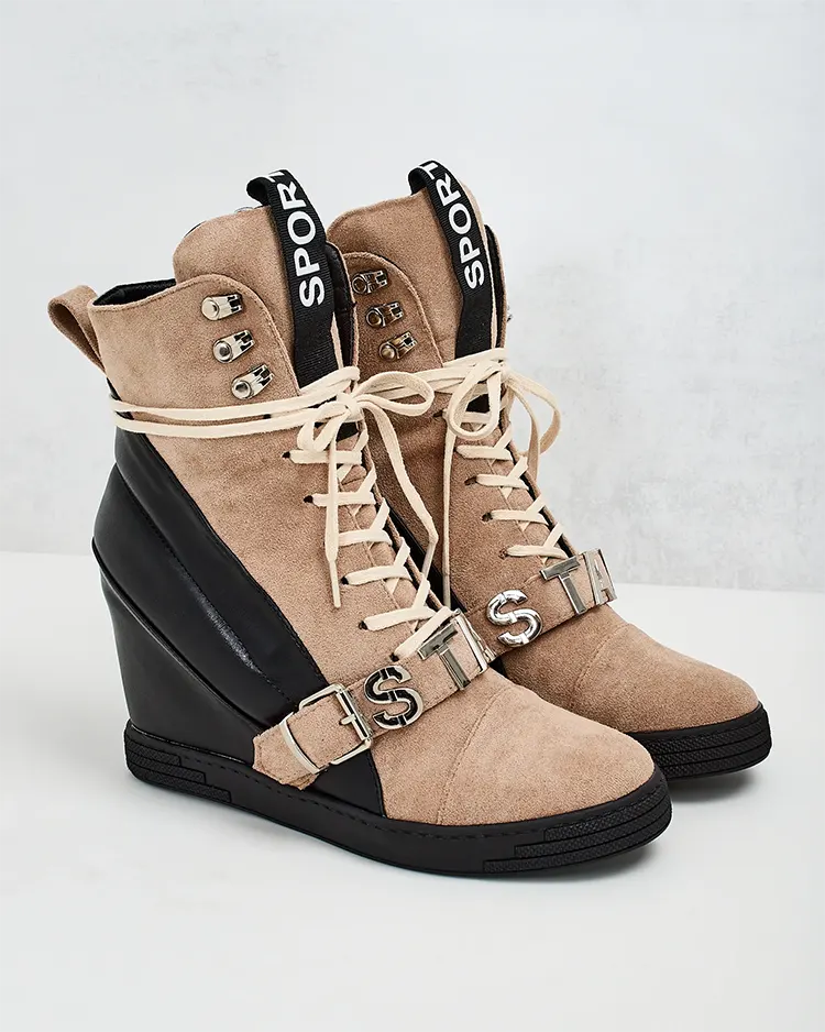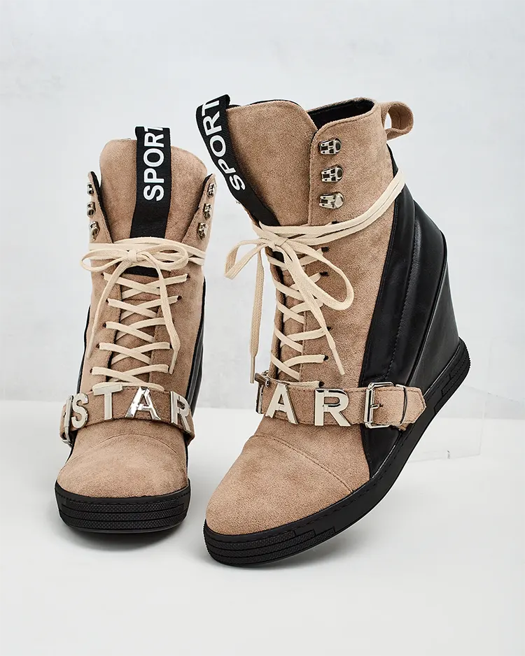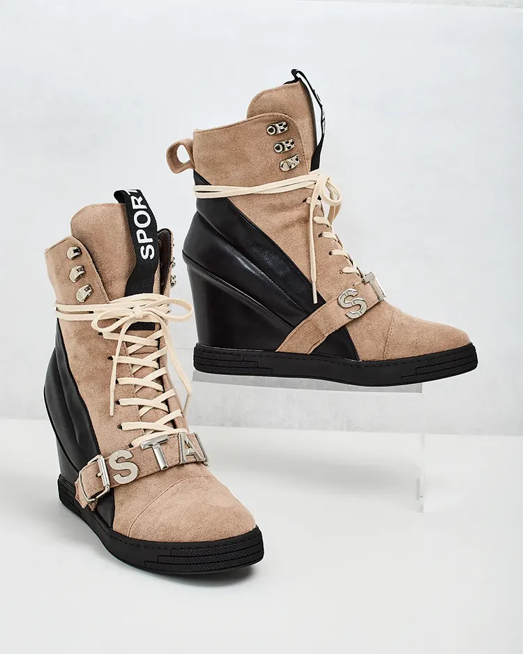 - Спортни дамски боти на токчета, изработени от комбинация от екокожа и екокожа. Вързани обувки с декоративни елементи в горната част, вътрешна стелка от плат.
