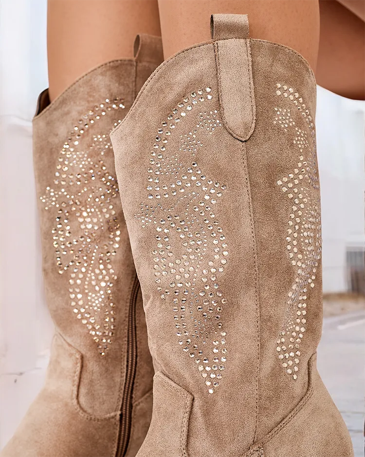 - Ботуши а'ла каубойски ботуши с нисък ток, изработени от органична кожа от велур, украсени с циркони. Отвътре са подплатени с мека кожа, ботушите са с цип до средата на прасеца. Подхождат на много женски стайлинг!