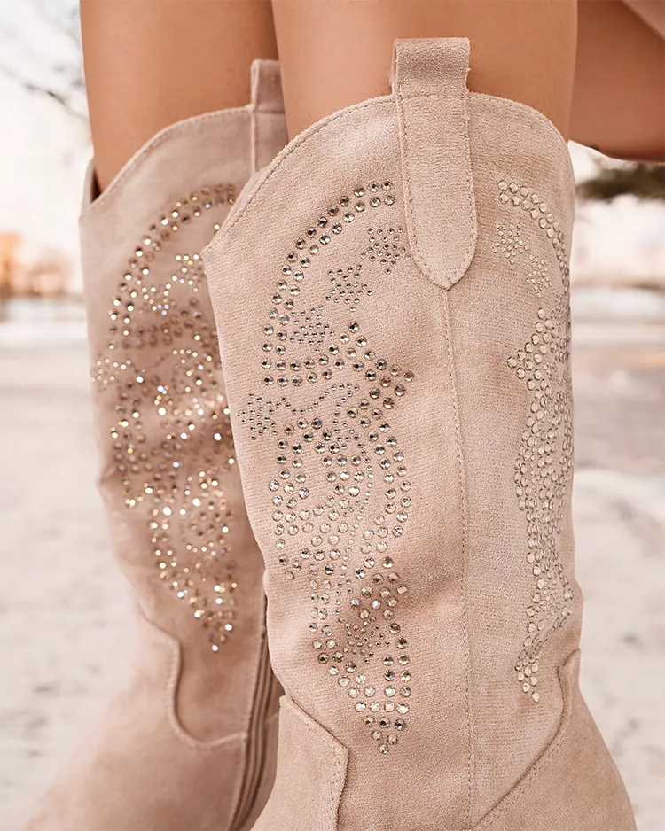 - Ботуши а'ла каубойски ботуши с нисък ток, изработени от органична кожа от велур, украсени с циркони. Отвътре са подплатени с мека кожа, ботушите са с цип до средата на прасеца. Подхождат на много женски стайлинг!
