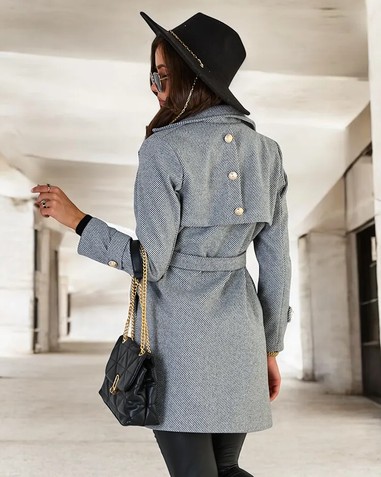 - Вечно актуално дамско палто с дължина до коляното и с колан с връзки на талията. Моделът е с дълги ръкави и закопчаване с копчета. Има подплата. Перфектен избор за есента! ЗАБЕЛЕЖКА: Точност на измерването (+/-) 1 см. Размерите са измерени в плосък ръст.