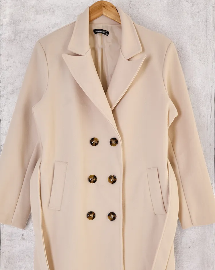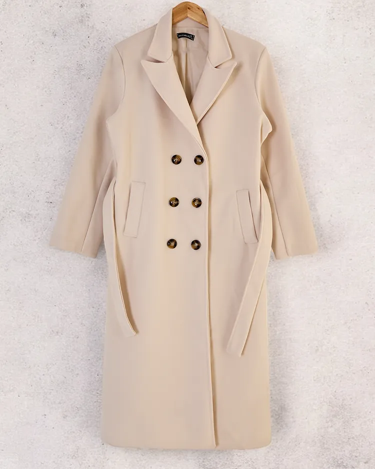 • Дълго дамско палто, изработено от приятен материал. Моделът е с дълги ръкави, закопчаване с копчета и декоративна връзка. Има подплата. Идеален избор за есента! ЗАБЕЛЕЖКА: Точност на измерването (+/-) 1 см. Размерите са измерени в плосък ръст.
