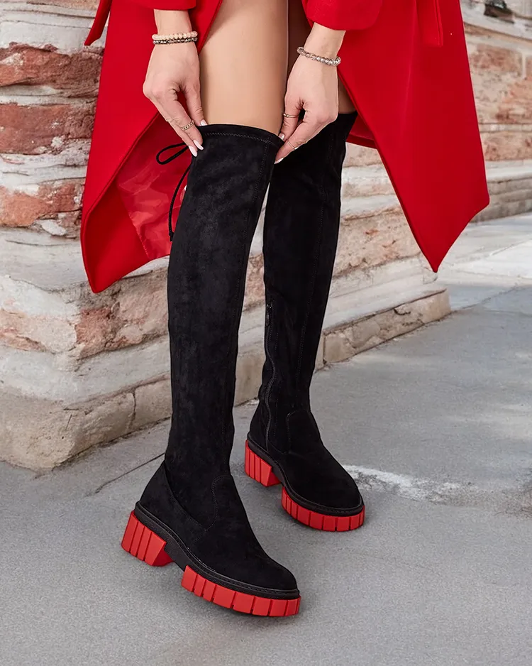 - Дълги дамски ботуши с по-дебела подметка, горна част от еко велур. Моделът е с кожена стелка. Ботушите се закопчават с цип до средата на прасеца и имат кант. Перфектна основа за много зимни тоалети!