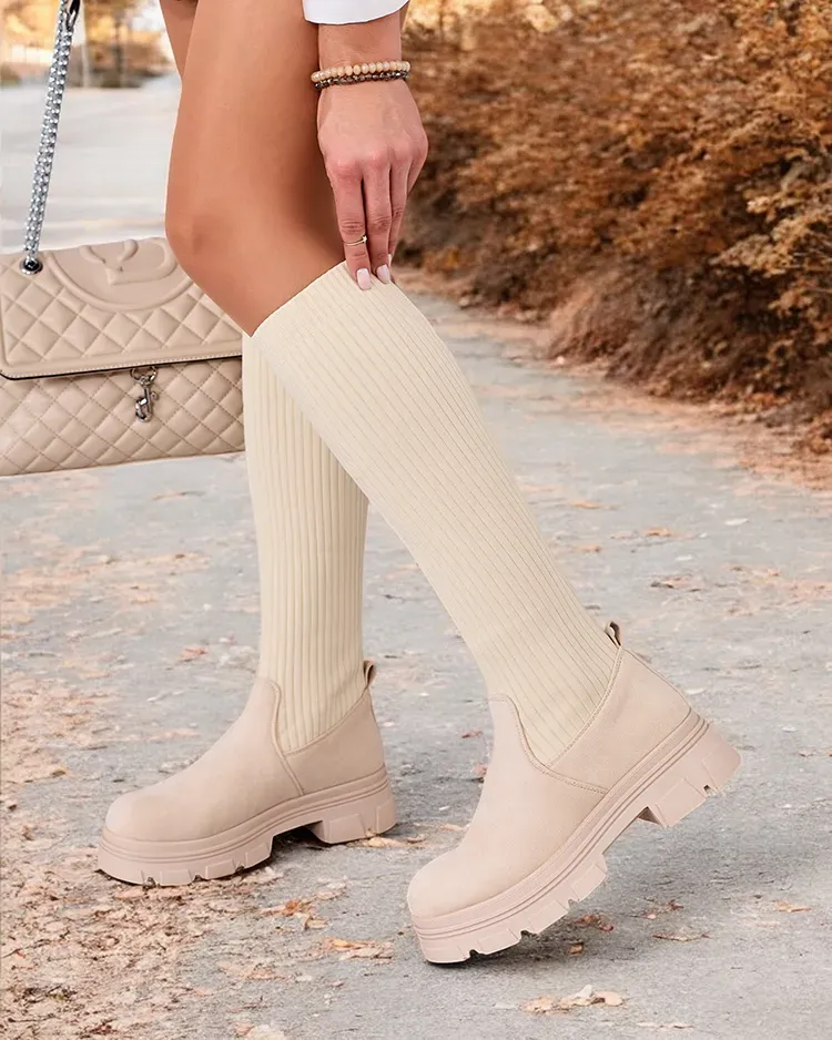 - Стилни дамски ботуши до коляното с плосък ток. Горната част е изработена от еластичен текстилен материал в комбинация с еко велур, вътрешна стелка от кожа. Модел с приплъзване. Идеални за ежедневните есенни тоалети!