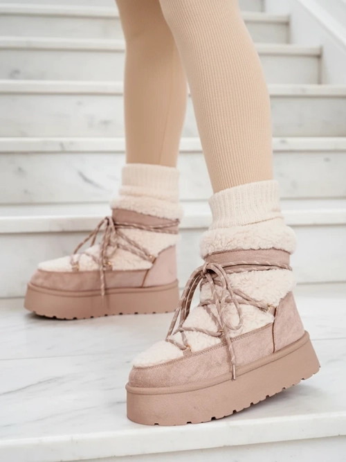 - Дамски ботуши за сняг с горна част, изработена от комбинация от еко велур и а' ла овча кожа. Подплатени с кожа отвътре, обувки за обуване с приплъзване и дантела. Перфектни за зимата!