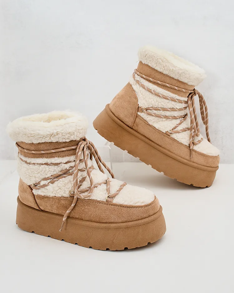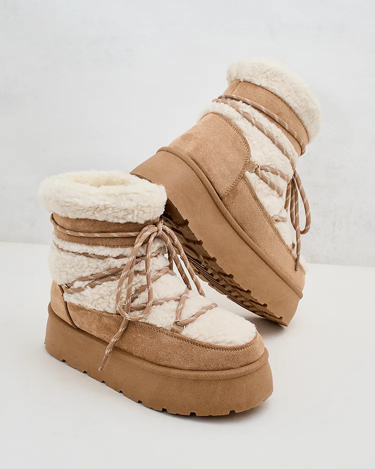 • Дамски ботуши за сняг с горна част, изработена от комбинация от еко велур и материал от овча кожа a' la. Подплатени с кожа отвътре, обувки за обуване с приплъзване и дантела. Перфектни за зимата!