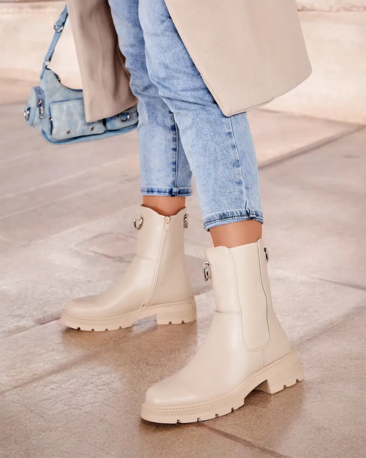 - Ботуши с плоска подметка - стил и комфорт в едно. Модел с цип и кръгъл нос. Обувки, изработени от екологична кожа. Стелка от плат. Идеални за есенните тоалети!