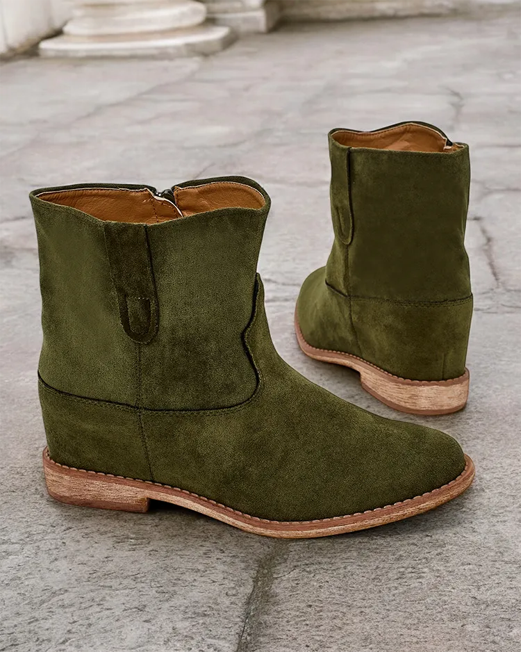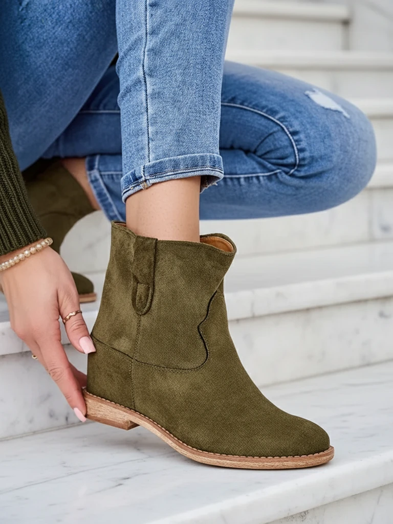 - Бежови ботуши в стил каубой, изработени от еко кожа, прилична на велур. Моделът има изолация от мека козина вътре. Обувките са на ниска покрита клиновидна пета. Обувките се закопчават с цип.
