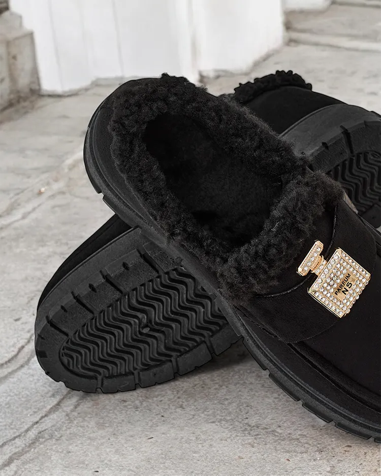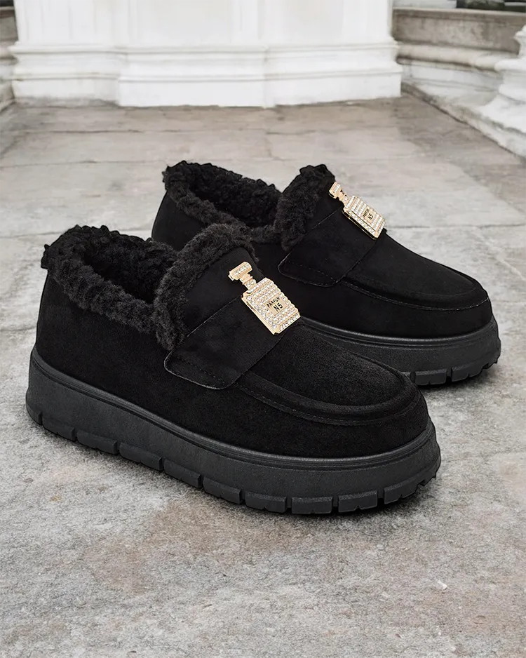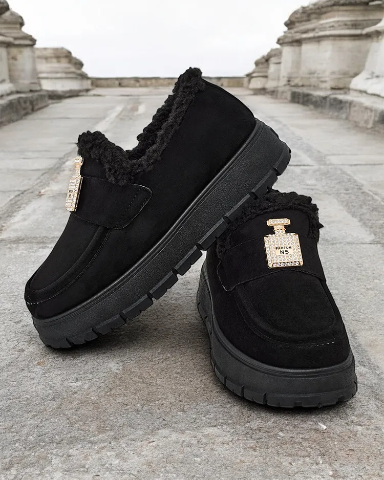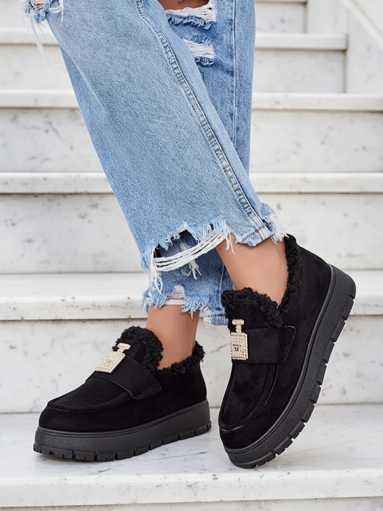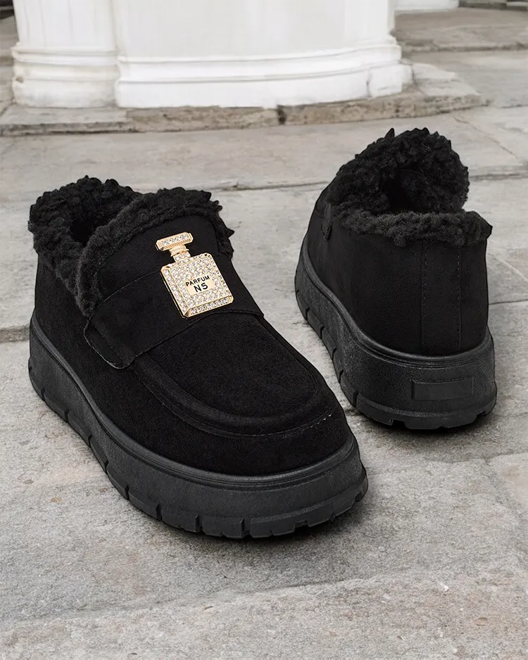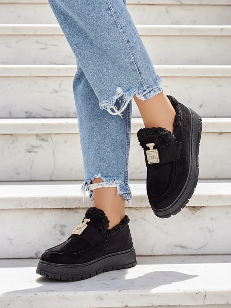 - Отоплени дамски мокасини на платформа. Класически модел, изработен от екологична велурена кожа и пълнеж а'ла кожух. Подметка във формата на платформа. Неподвижна украса с цирконии на горната част.