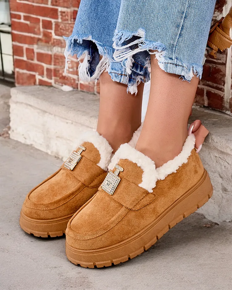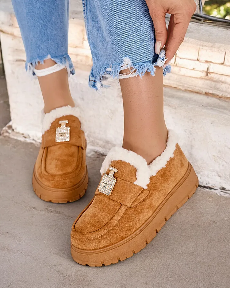 - Ocieplane damskie mokasyny na platformie. Klasyczny model wykonany z zamszowej skóry ekologicznej oraz wypełnienia a' la kożuszek. Podeszwa w formie platformy. Na cholewce nie zdejmowana ozdoba z cyrkoniami.