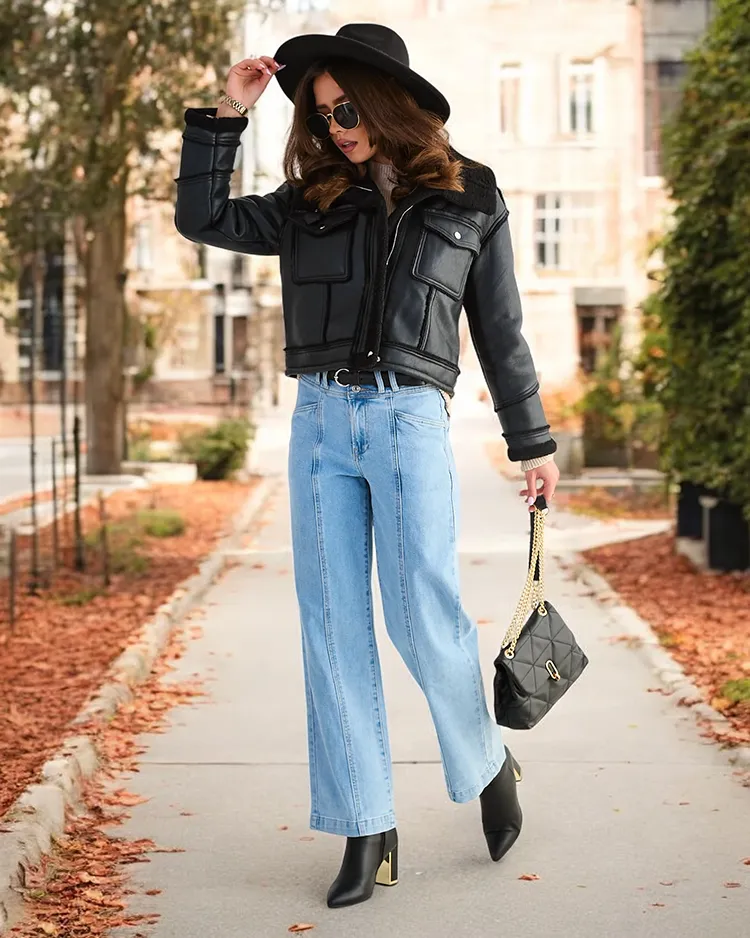 Royalfashion Дамско еко кожено яке с косъм в черен цвят