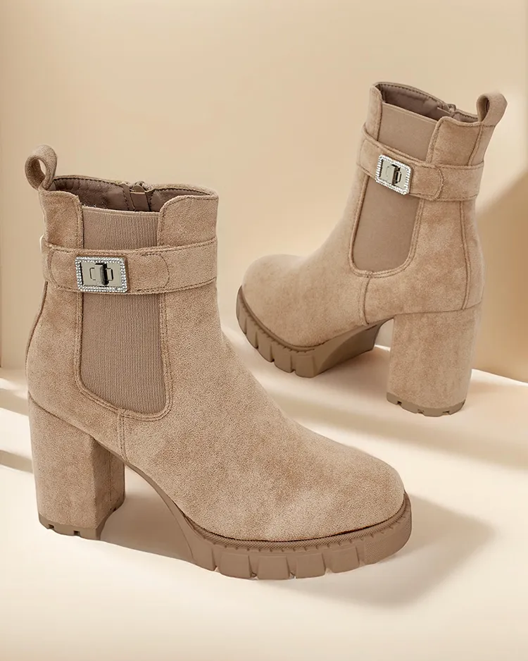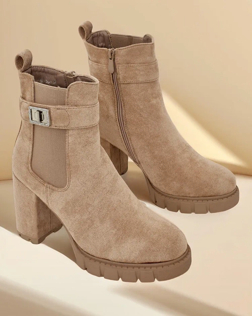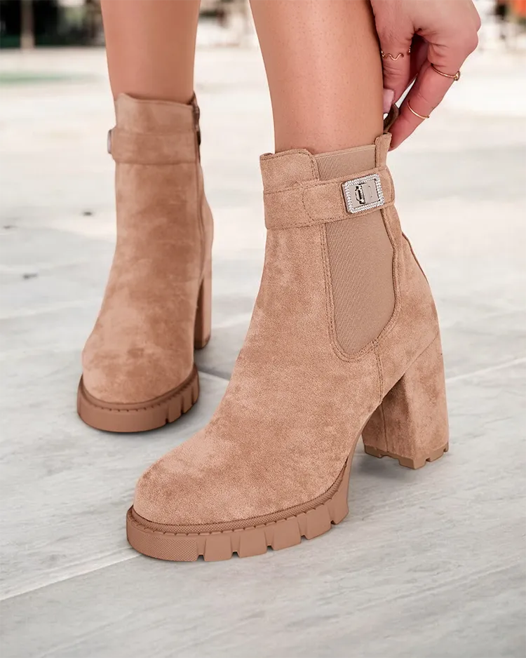 • Глезенови ботуши на поста - стил и комфорт в едно. Модел, закопчан с цип с кръгла предна част. Обувки от екологична замша. Вътрешността е пълна с косъм. Идеални за есенни тоалети!