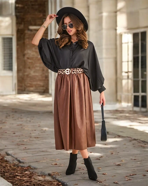 - Стилен дамски миди пола, изработен от еко кожа, сластична талия и декоративна колан. Разкроена пола. Необходима част от гардероба на всяка жена!
