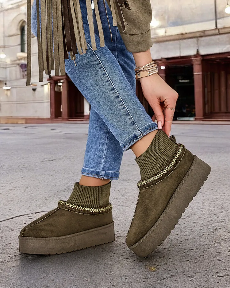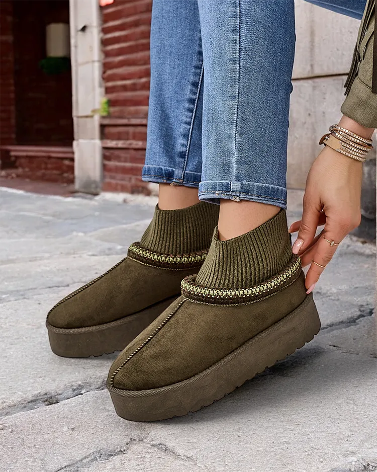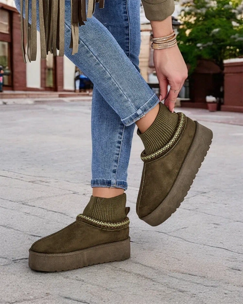 - Големи женски зимни снежни ботуши на платформа. Горната част е изработена от изкуствена велурна кожа, подплатена с кожух. Идеална основа за зимата!