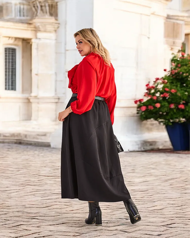 - Дамска миди пола от мека материя. Моделът е с колан. Идеална основа за много уникални тоалети! ЗАБЕЛЕЖКА: Точност на измерването (+/-) 1 см.