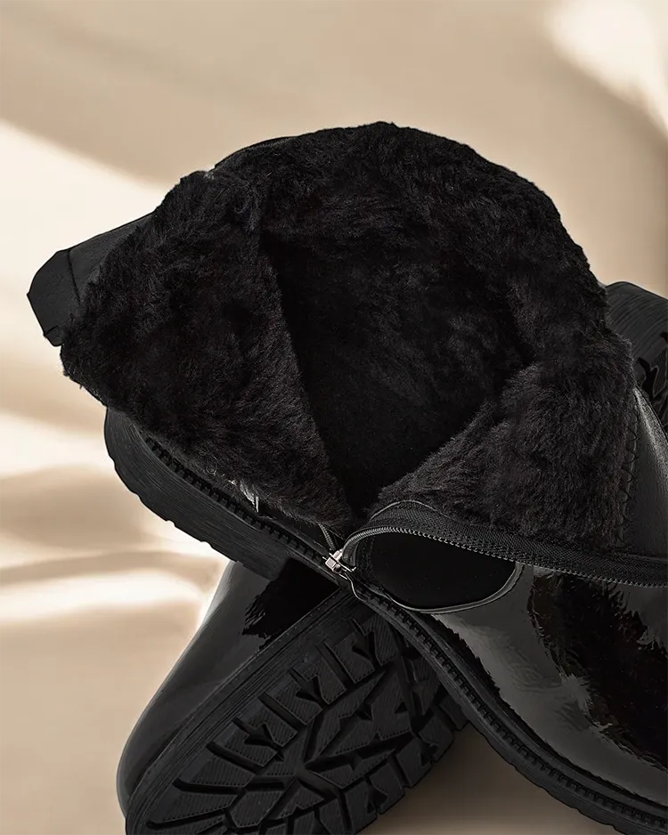 - Стилни дамски ботуши - идеалният модел за ежедневно носене! Горната част е изработена от матова еко кожа, с вметките от лакова еко кожа. Вътрешността е подплатена с кожух. Обувките имат цип за затваряне.