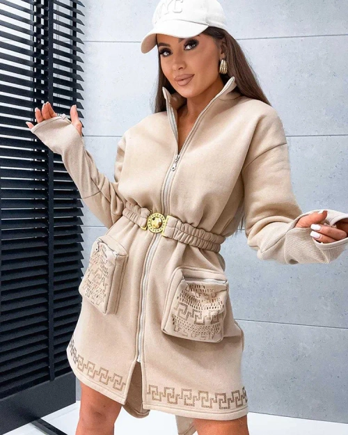 - Много стилна дамска дълга блуза в стил рокля, изработена от приятен материал. Моделът разполага с дълъг ръкав, асиметрично долу и декорация с пайети. Допълнително, има колан в комплекта. Точност на измерването (+/-) 1 см.