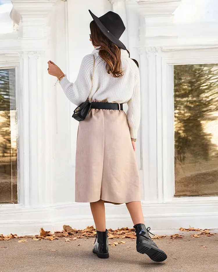 - Женска миди пола направена от мека тъкан а'ла замша. Моделът включва колан. Идеална основа за много специални тоалети! ВНИМАНИЕ: Точност на измерването (+/-) 1 см.