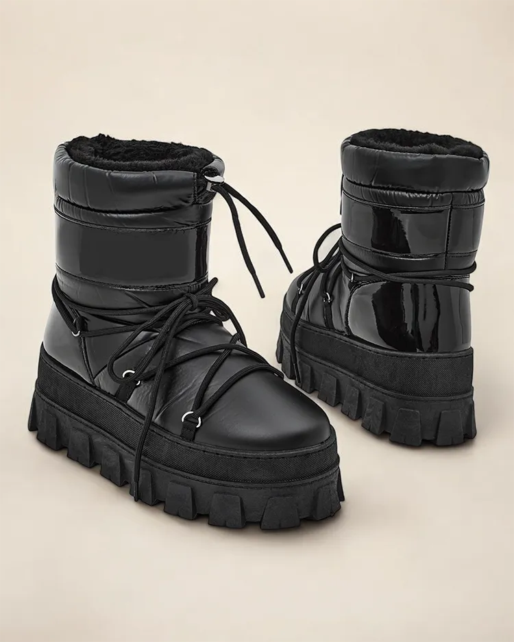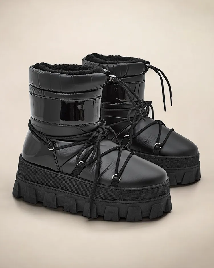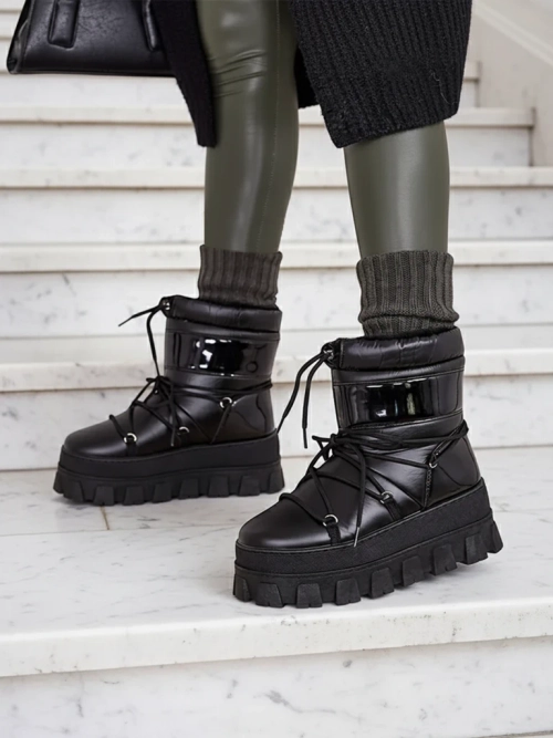 - Дамски снежни ботуши с горна част направена от комбинация от платообразна материя и лакирани кожи. Вътре има приятна подплата от кожа, обувка за бързо обуване и връзки. Идеални за зимата!