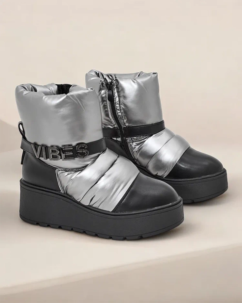 - Дамски снежни ботуши с горна част, направена от комбинация от плат, подобен на ваксиран плат, и еко кожа. Вътре има приятно пухкаво подплънка, обувката е на сгъване и с цип. Идеални за зимата!