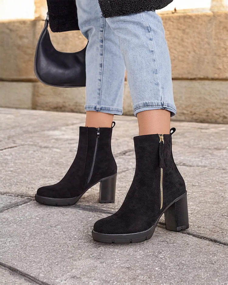 - Стилни дамски глезенки са идеалното решение за по-студените дни. Горната част е закопчана с цип, а отвътре има подплата от кожа. Моделът е на пост, с кръгла обувка. Прекрасно допълнение към вашите ежедневни тоалети!