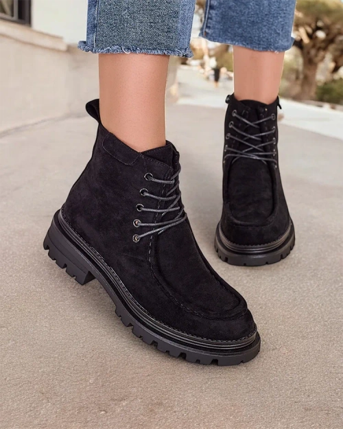 - Стилни обувки на глезена, изработени от еко велур и с подплънка от кожа. Обувките са с връзки и цип. Моделът има по-дебела подметка. Идеални за есен!
